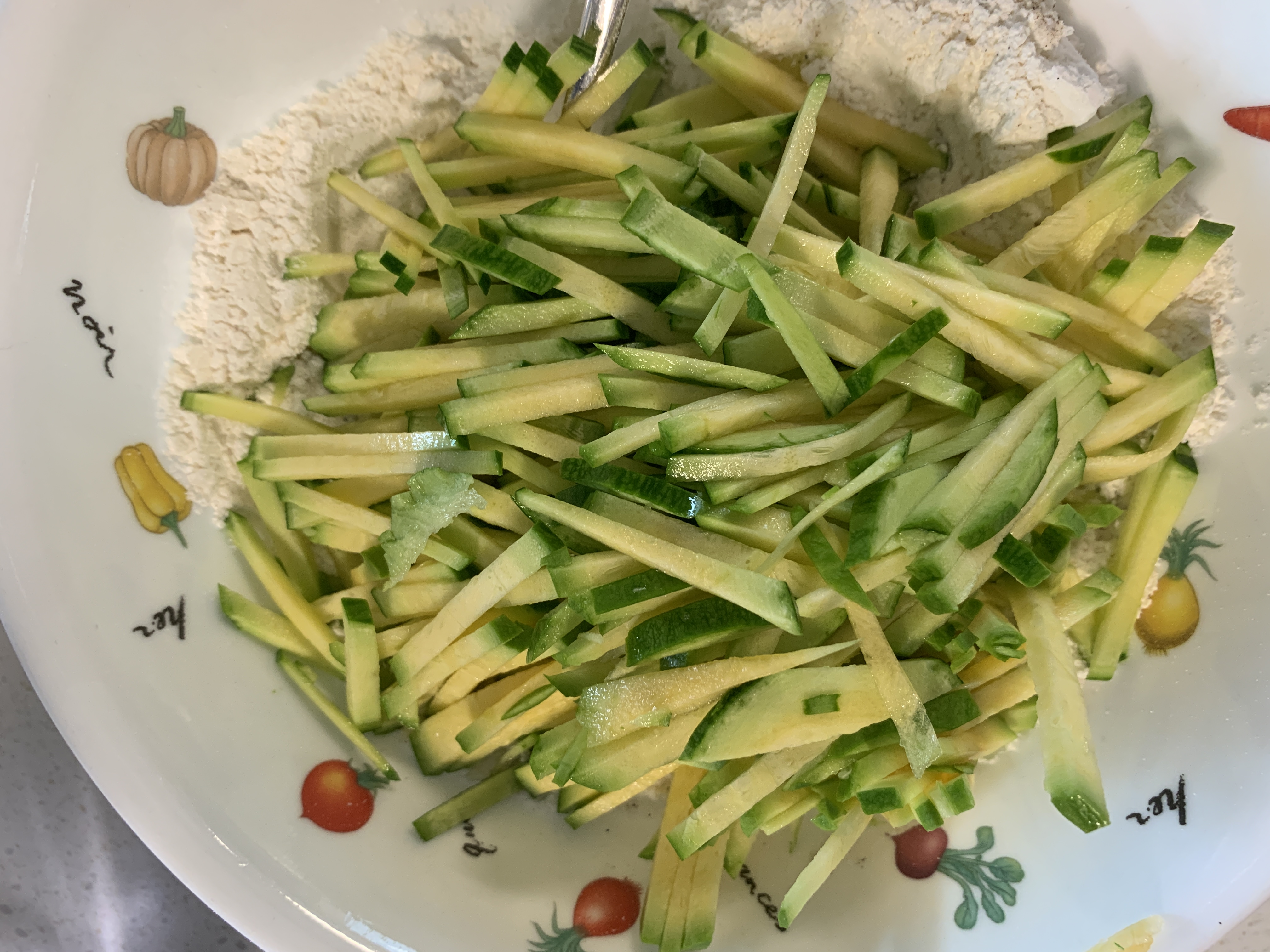 그리고 아까 섞어두었던 가루에 애호박을 넣어줄게요