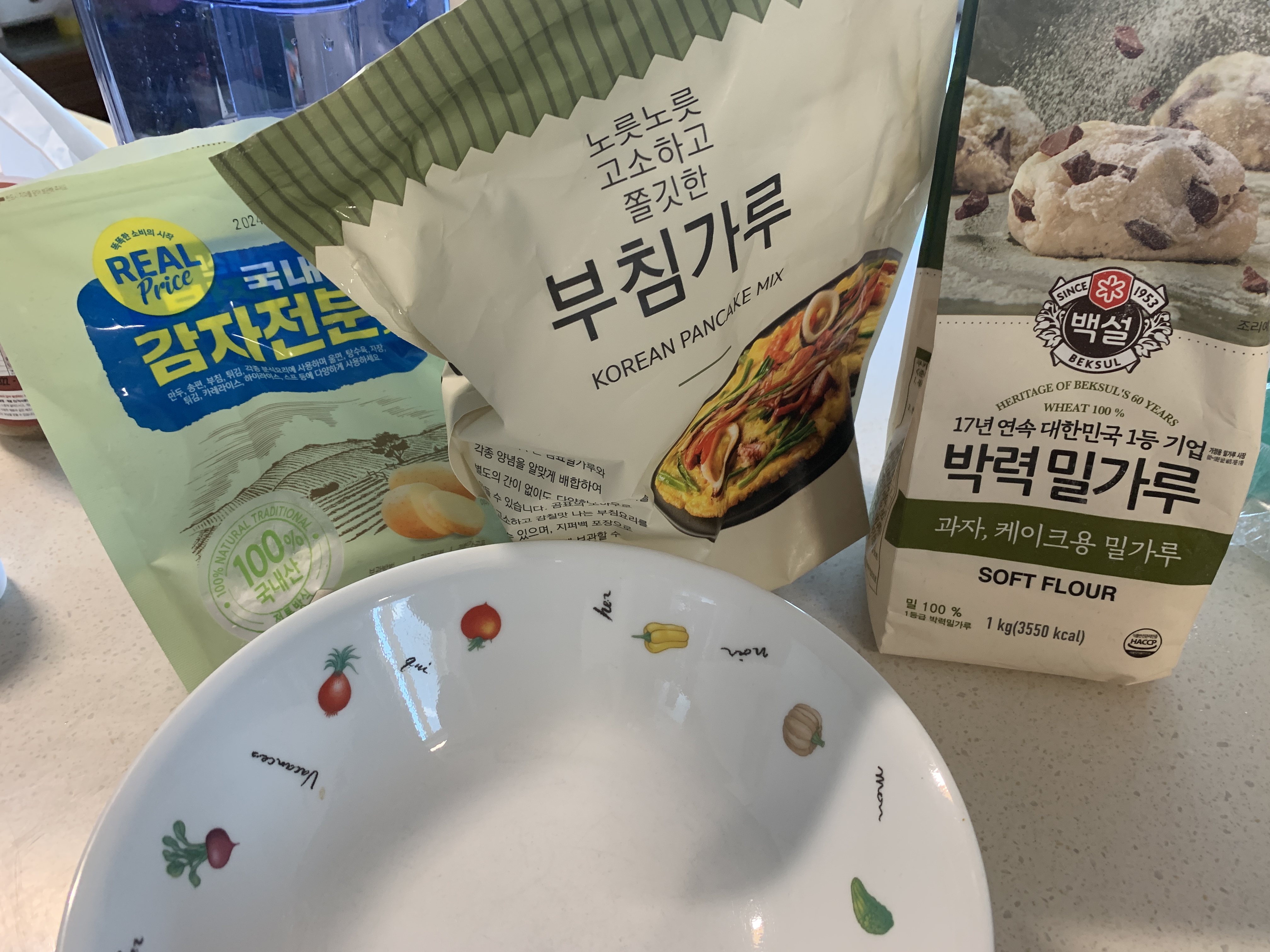전 부침가루와, 박력분, 전분가루, 다시다, 후추 이렇게 반죽에 넣었어요