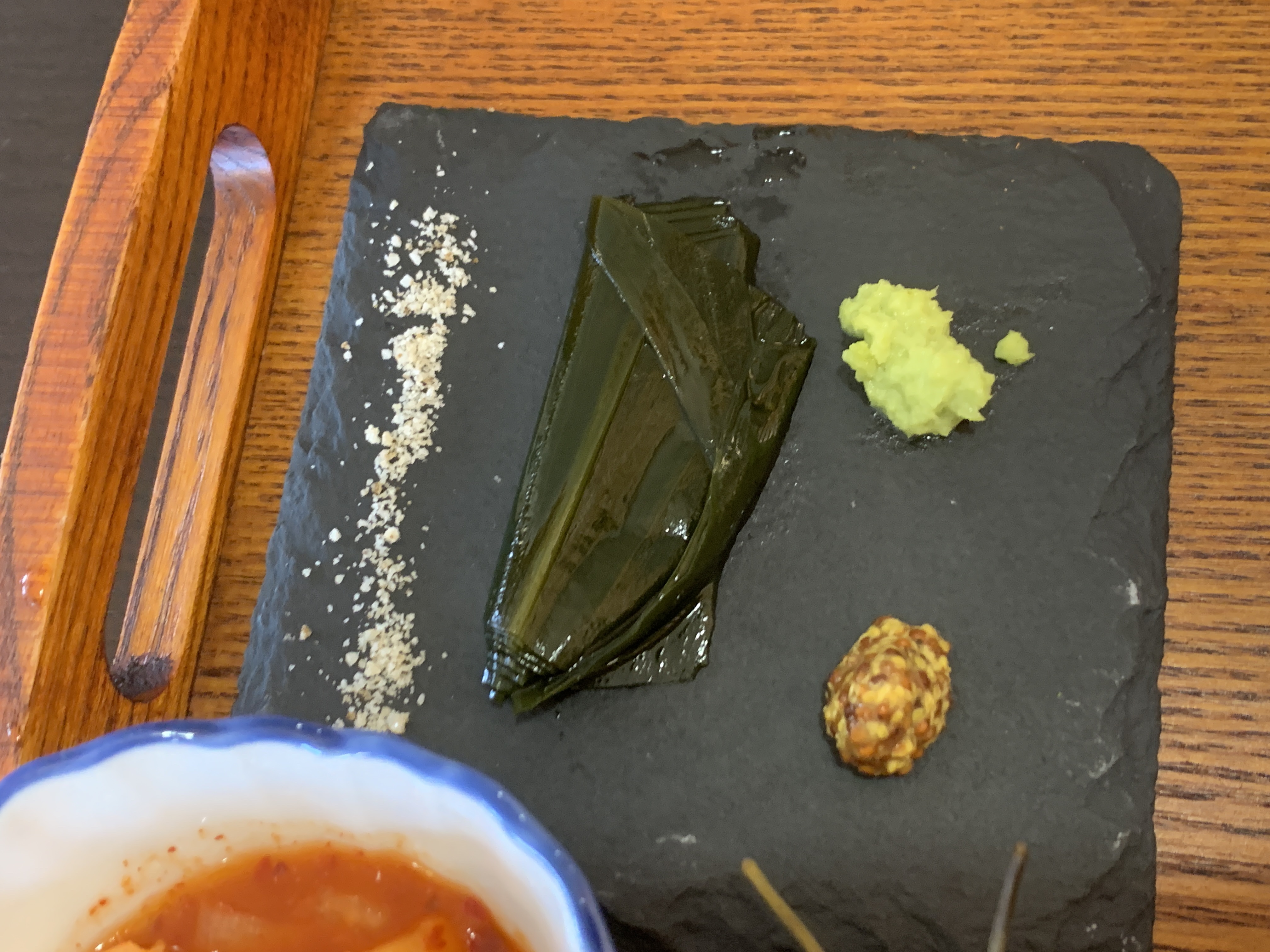 여기는 신기하게 소고기전문점처럼 명이나물, 고추냉이, 홀그레인, 함초소금을 주고