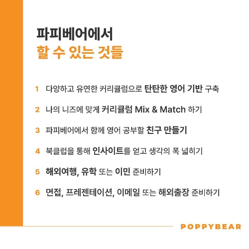 전 여기 파피베어 영어 클래스에서 영어가 재미있고 쉽다는 걸 배웠답니다